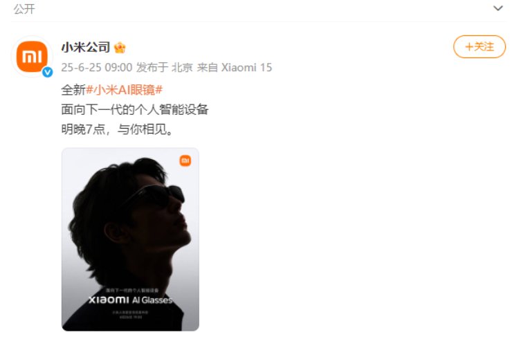 6月25日,小米官方微博宣布,将于26日晚7点发布的“面向下一代的个人智能设备”为小米AI眼镜。