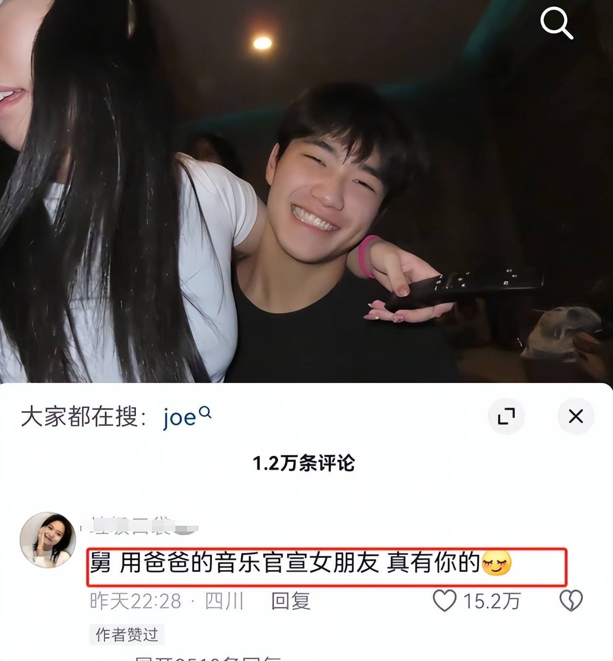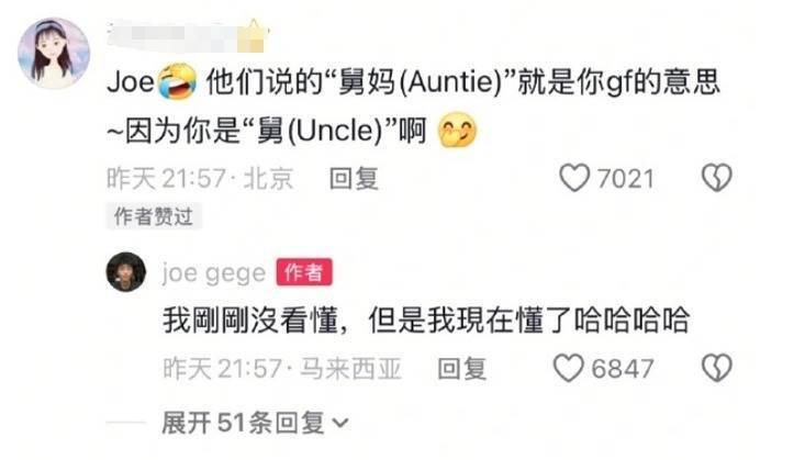 两日前,Joe又上传好友合照,一群少年坐在沙滩栏杆上尽显蓬勃气息,点赞评论的过程中,突然有粉丝发现Joe点赞了“怎么没看到舅妈”的评论,于是再度引发恋爱猜测,这才有了后续沙发索吻官宣恋爱的戏码。