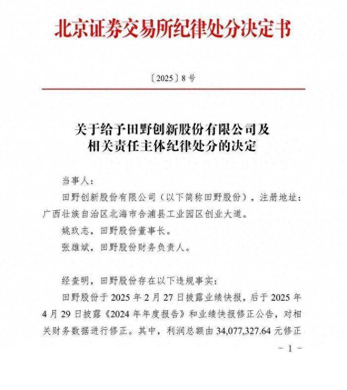 公告显示,公司存在以下违规事实:田野股份在2025年2月27日披露的业绩快报,后于2025年4月29日披露《2024年年度报告》和业绩快报修正公告,对相关财务数据进行修正。其中,利润总额由3408万元修正为1421万元,归属于上市公司股东的净利润由2859万元修正为965万元。田野股份未及时披露修正公告。此外,田野股份未披露业绩预告。