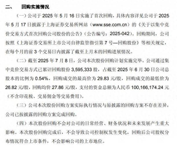 7月9日,道通科技(688208)公告称,截至2025年7月8日,公司本次股份回购计划实施完毕。公司通过集中竞价交易方式已累计回购股份3,595,333股,占截至2025年6月30日公司总股本的比例为0.54%,回购成交的最高价为29.83元/股,回购成交的最低价为26.82元/股,回购均价27.86元/股,支付的资金总额为人民币100,166,174.24元(不含印花税、交易佣金等交易费用)。